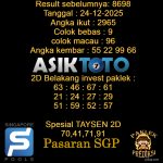 Prediksi Togel Asiktoto Singaporepools 24 Desember 2025. adalah salah satu motode peracikan angka togel melalui rumus dari para master prediksi yang ada. Prediksi togel membantu para pecinta permainan togel untuk menebak angka result togel yang akan keluar. PREDIKSI SINGAPORE ASIKTOTO HARI INI Result sebelumnya: 8698 Tanggal : 24-12-2025 Angka ikut : 2965 Colok bebas […]