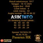Prediksi Togel Asiktoto Hari Ini Hongkonglotto 18 Desember 2025. adalah salah satu motode peracikan angka togel melalui rumus dari para master prediksi yang ada. Prediksi togel membantu para pecinta permainan togel untuk menebak angka result togel yang akan keluar PREDIKSI HONGKONG ASIKTOTO HARI INI Result sebelumnya: 1917 Tanggal : 18-12-2025 Angka ikut : 2648 […]