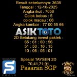 Prediksi Togel Asiktoto Singaporepools 12 Oktober 2025. adalah salah satu motode peracikan angka togel melalui rumus dari para master prediksi yang ada. Prediksi togel membantu para pecinta permainan togel untuk menebak angka result togel yang akan keluar. PREDIKSI SINGAPORE ASIKTOTO HARI INI Result sebelumnya: 3635 Tanggal : 12-10-2025 Angka ikut : 7056 Colok bebas […]