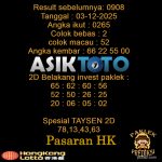 Prediksi Togel Asiktoto Hari Ini Hongkonglotto 03 Desember 2025. adalah salah satu motode peracikan angka togel melalui rumus dari para master prediksi yang ada. Prediksi togel membantu para pecinta permainan togel untuk menebak angka result togel yang akan keluar PREDIKSI HONGKONG ASIKTOTO HARI INI Result sebelumnya: 0908 Tanggal : 03-12-2025 Angka ikut : 0265 […]